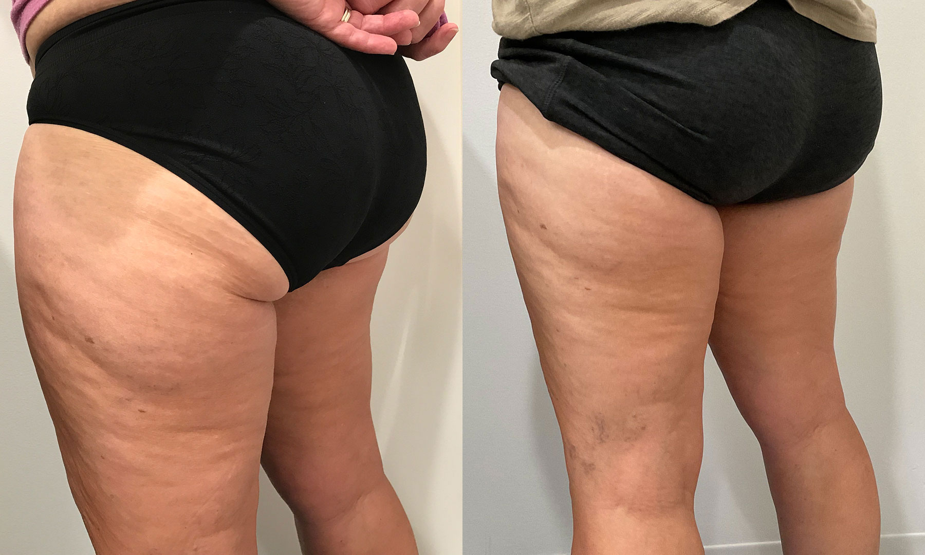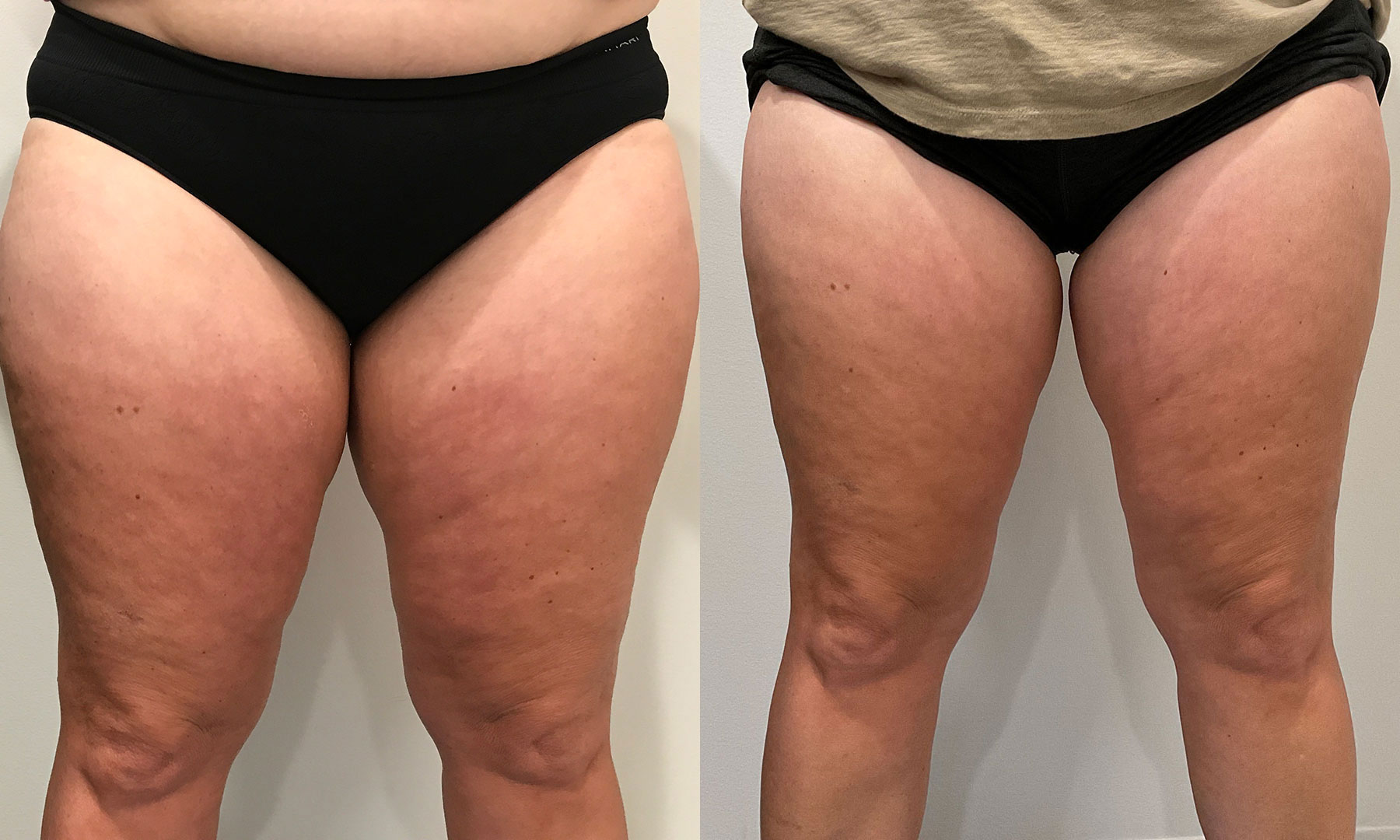 This patient wanted help slimming her legs, so she was treated with CoolSculpting Elite on the inner and outer thighs by Kara McCann, Licensed Esthetician, at Radiance Skin Therapy in Madison, WI. These results are only six weeks after her first treatment! Full results will be seen at three months so she will continue to see improvement. The silhouette of her outer thighs are significantly smoother, and we can easily see the decreased fat on the inner thighs as well.