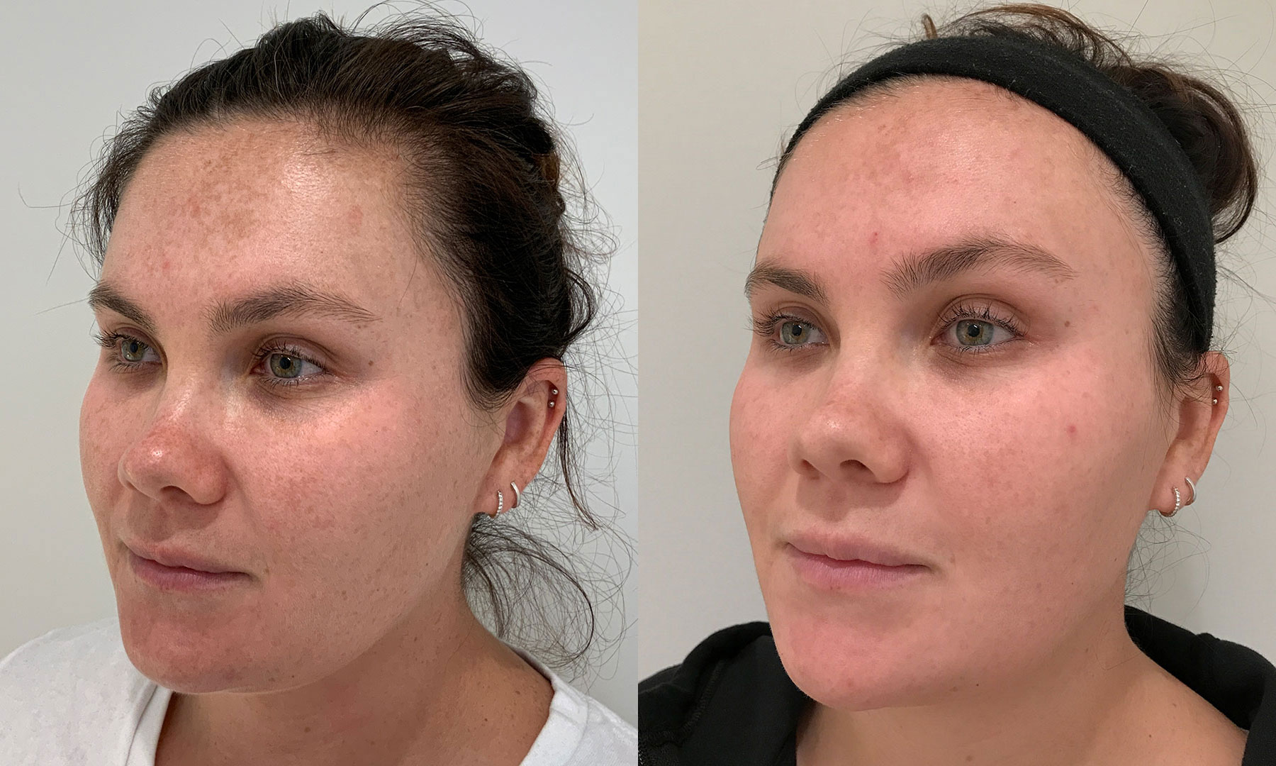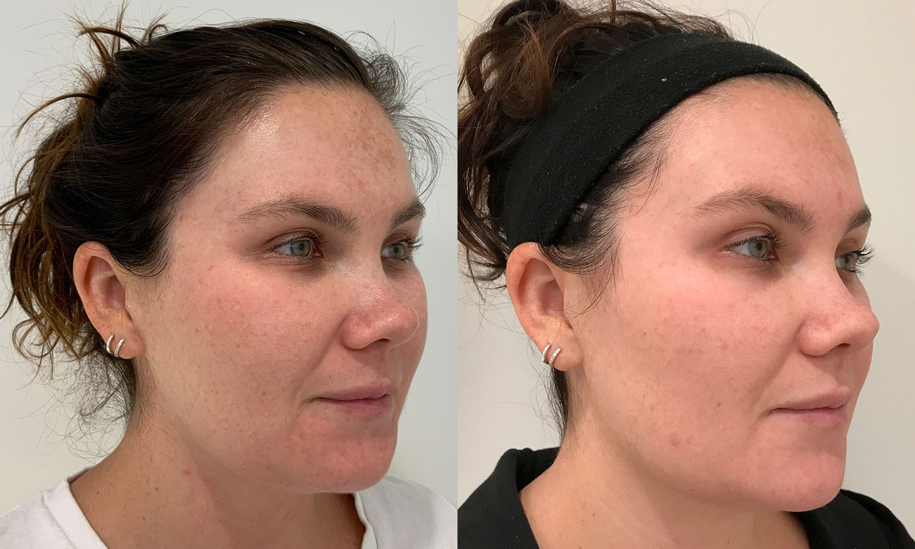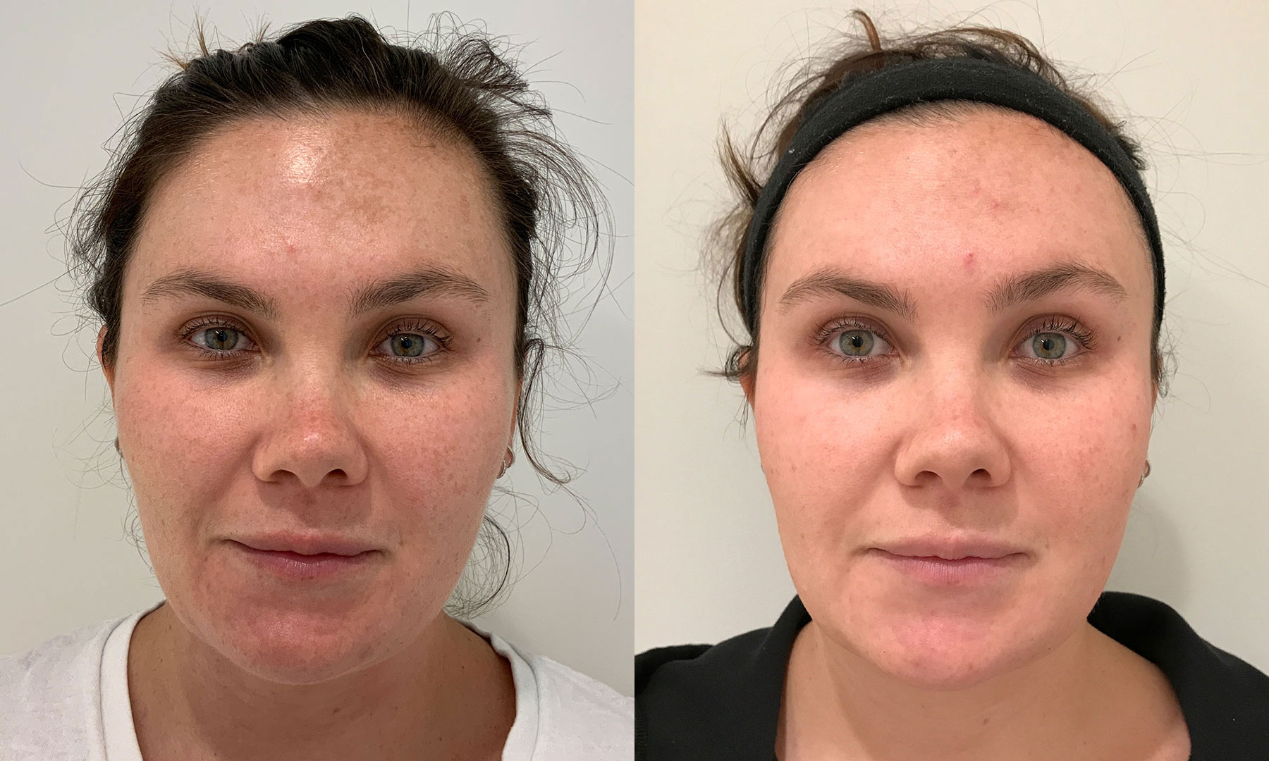 This is Taylor, one of our amazing Nurse Practitioners here at Radiance. She is very prone to hyperpigmentation, or dark spots and freckles, from sun exposure. Taylor was spot treated with the Aerolase focused in areas with the most pigment, like forehead and cheeks. Six weeks after the single treatment she has a significantly brighter and more even complexion.