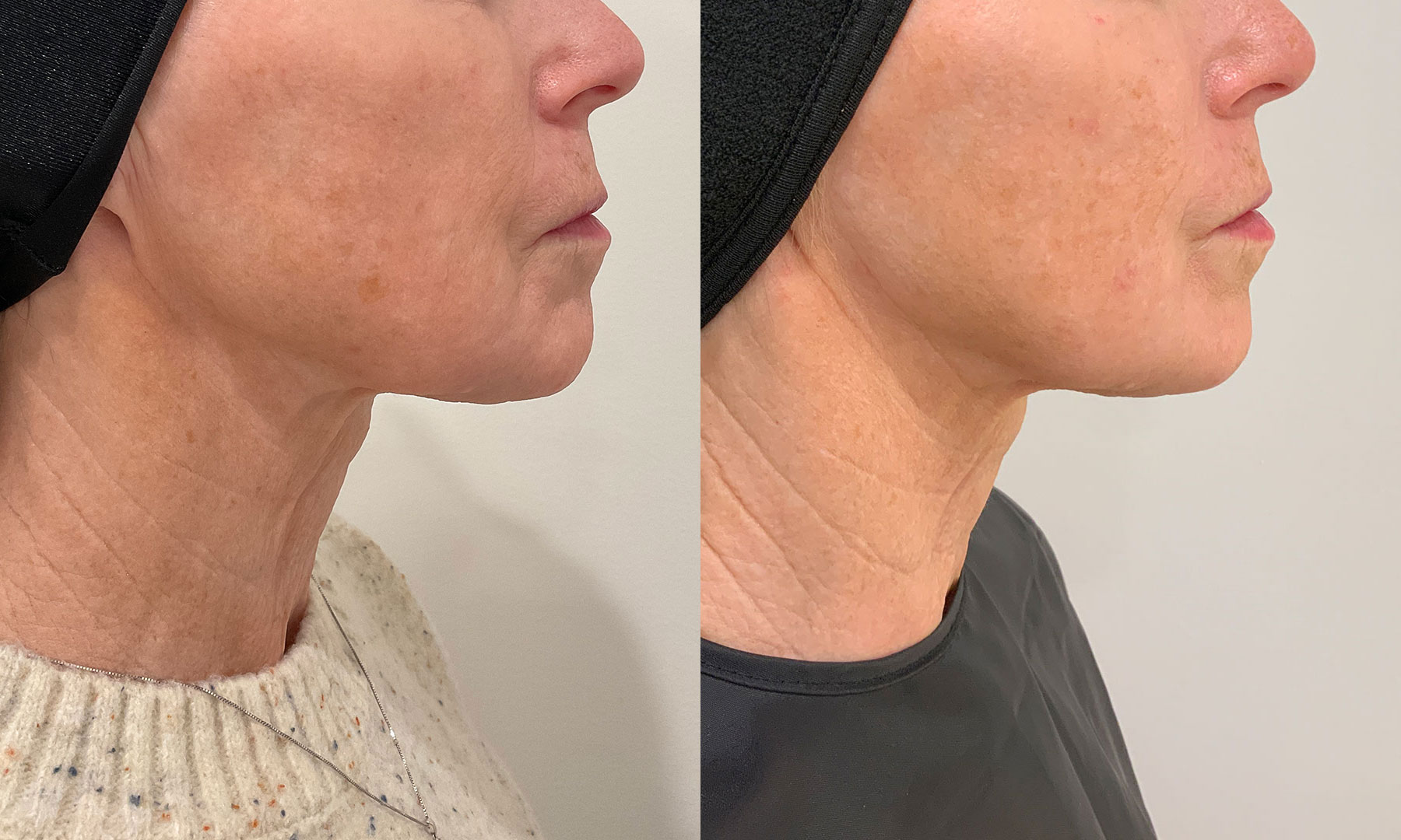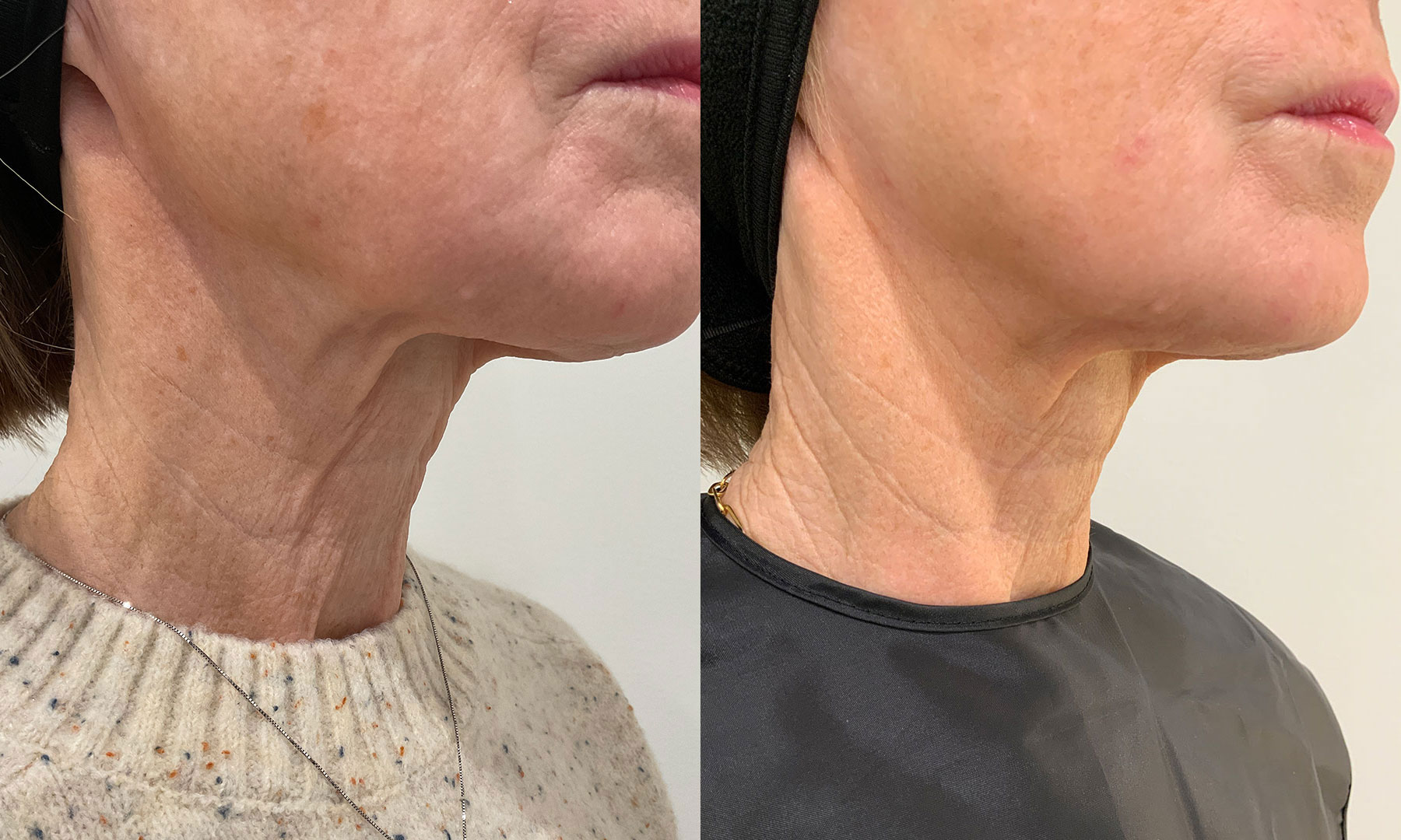 This patient wanted to target skin texture and laxity in the neck and lower face, so two treatments of were recommended by Rachel Rozeboom, Licensed Esthetician at Radiance Skin Therapy in Madison, WI. These results are six months after her second treatment. We see significant change in the neck, the skin looks healthier and tighter with fewer visible lines. We can also see tightening in the lower face, especially in the jowl area and around the mouth, which is smoother and more firm. She is loving her gradual, natural results that she got with no downtime!