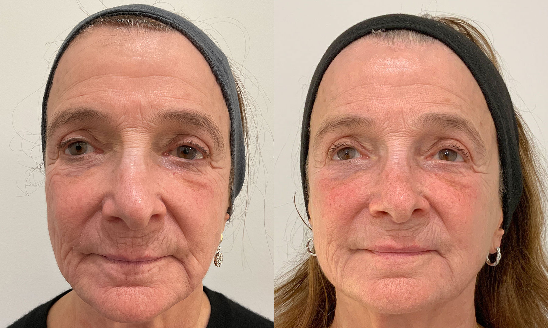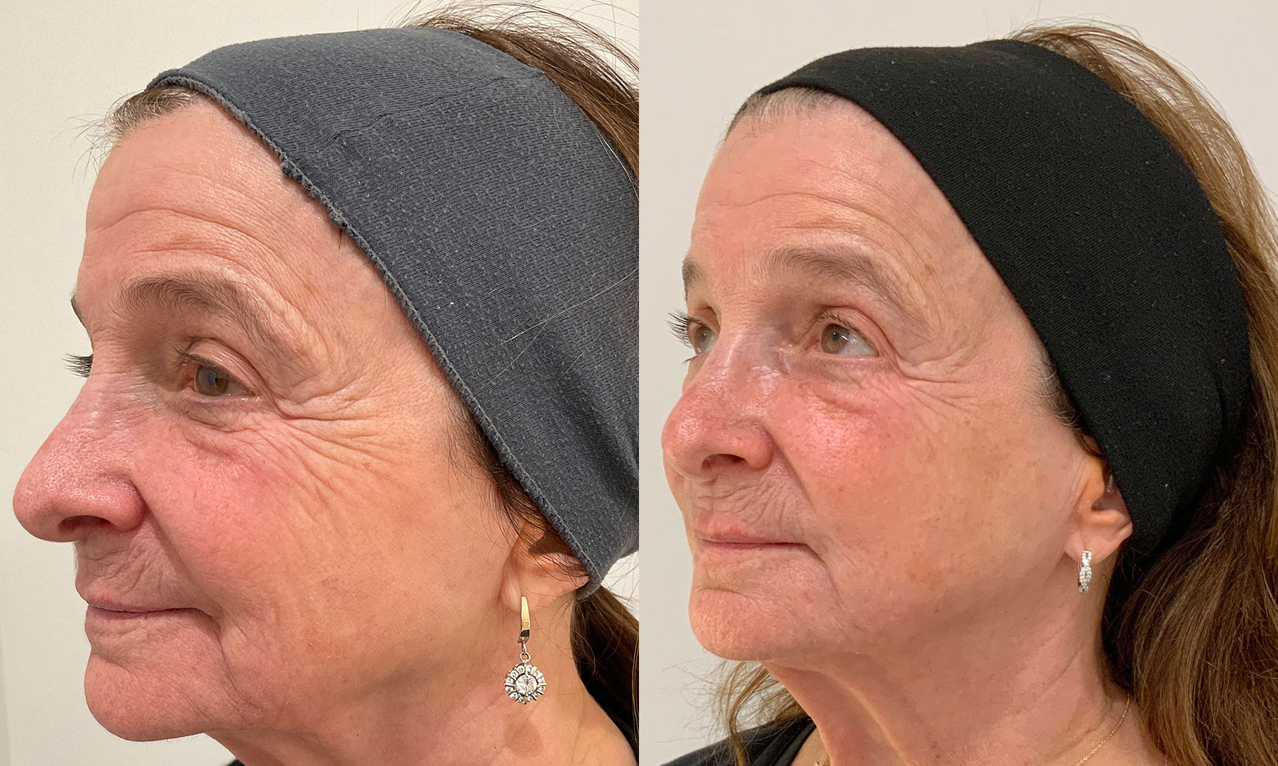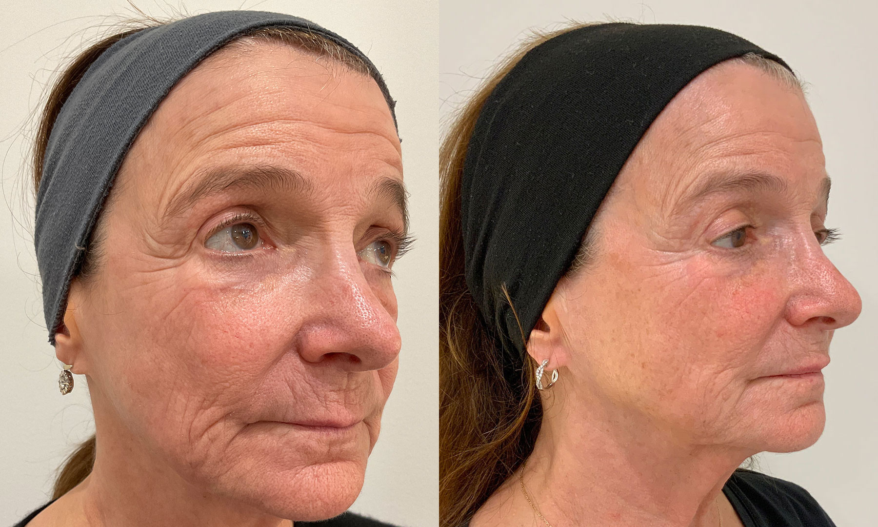 Sofwave was recommended for this patient to build collagen and elastin to help smooth lines and rejuvenate the skin. These results are six months after her second Sofwave treatment for the face and neck. We can see a slight lift in the brows and significant smoothing of the crow's feet and forehead lines. Her skin looks healthier and more supple and we can see a very natural increase in volume in the cheeks, making her look more youthful.