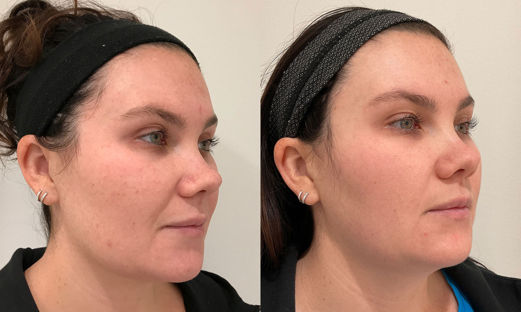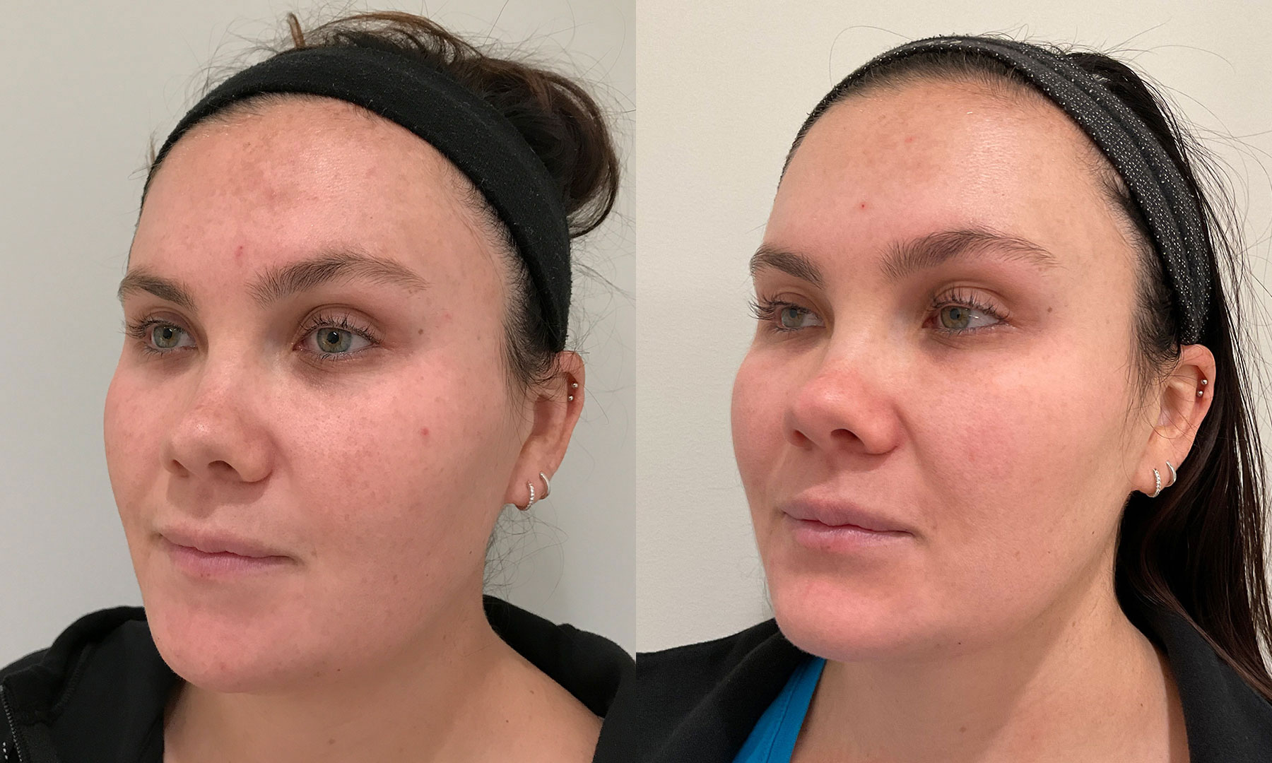 This cutie is one of our Nurse Practitioners here at Radiance! Taylor was treated with the ReveSkin Enlighten Depigmentation System, which is a specially formulated chemical peel to target hyperpigmentation and melasma. These photos are about eight weeks apart, but a more clear and brighter complexion can be seen as soon as one week!
