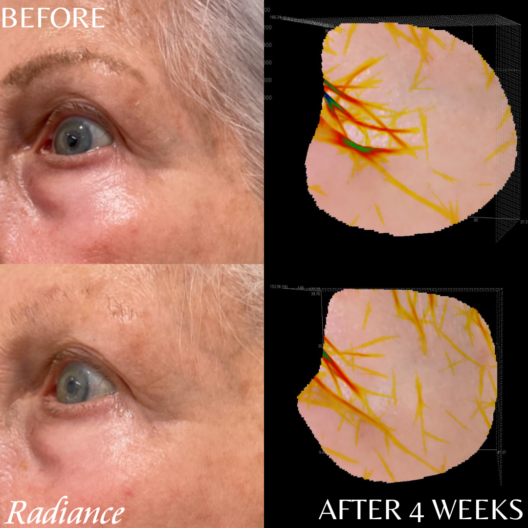 To address general signs of aging, the first product recommended for this lovely woman in her 60s was our Age-Defying Retinol Serum in .25% (and a sunscreen of course). When she returned to Radiance after only four weeks we were amazed by the improvements in texture and clarity in her skin! The images on the right were taken in our 3D camera to show the improvement in depth of expression lines.