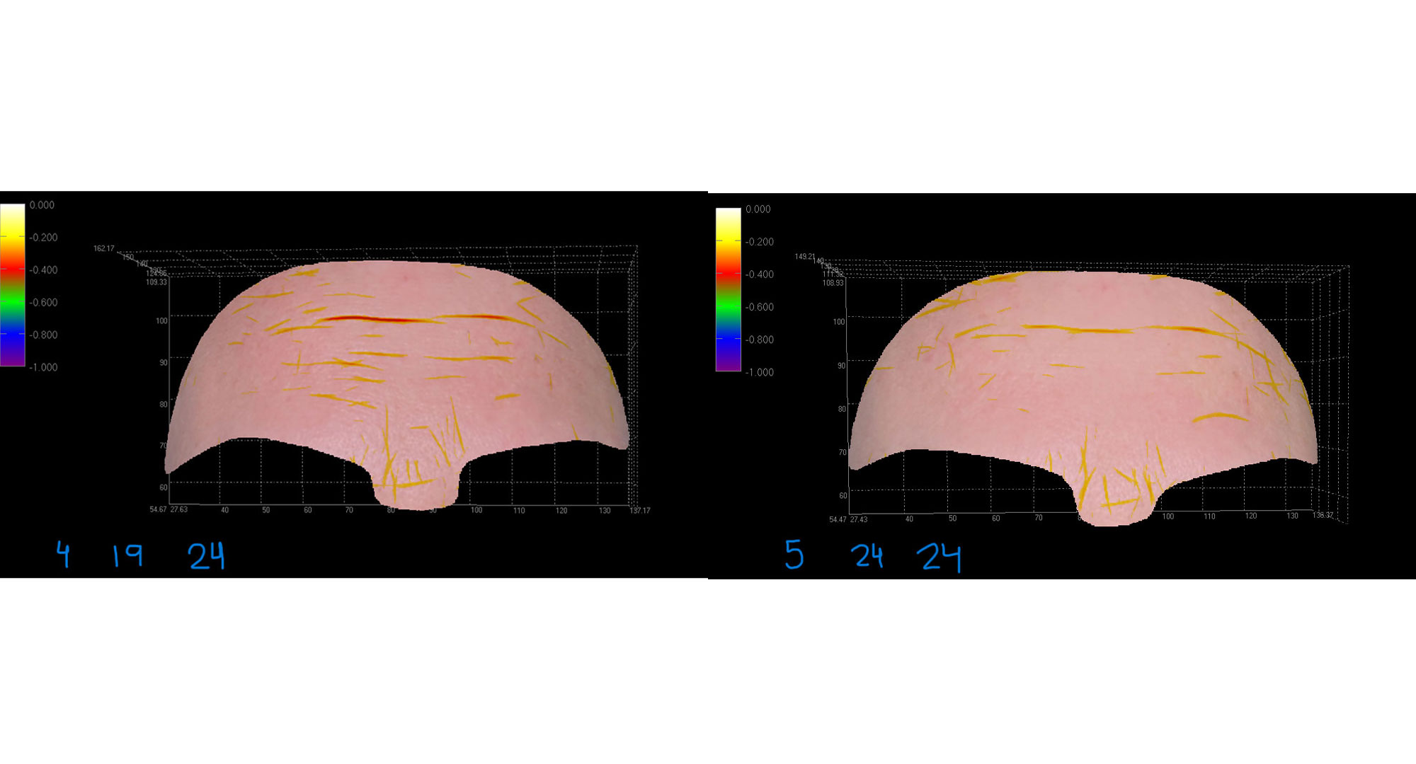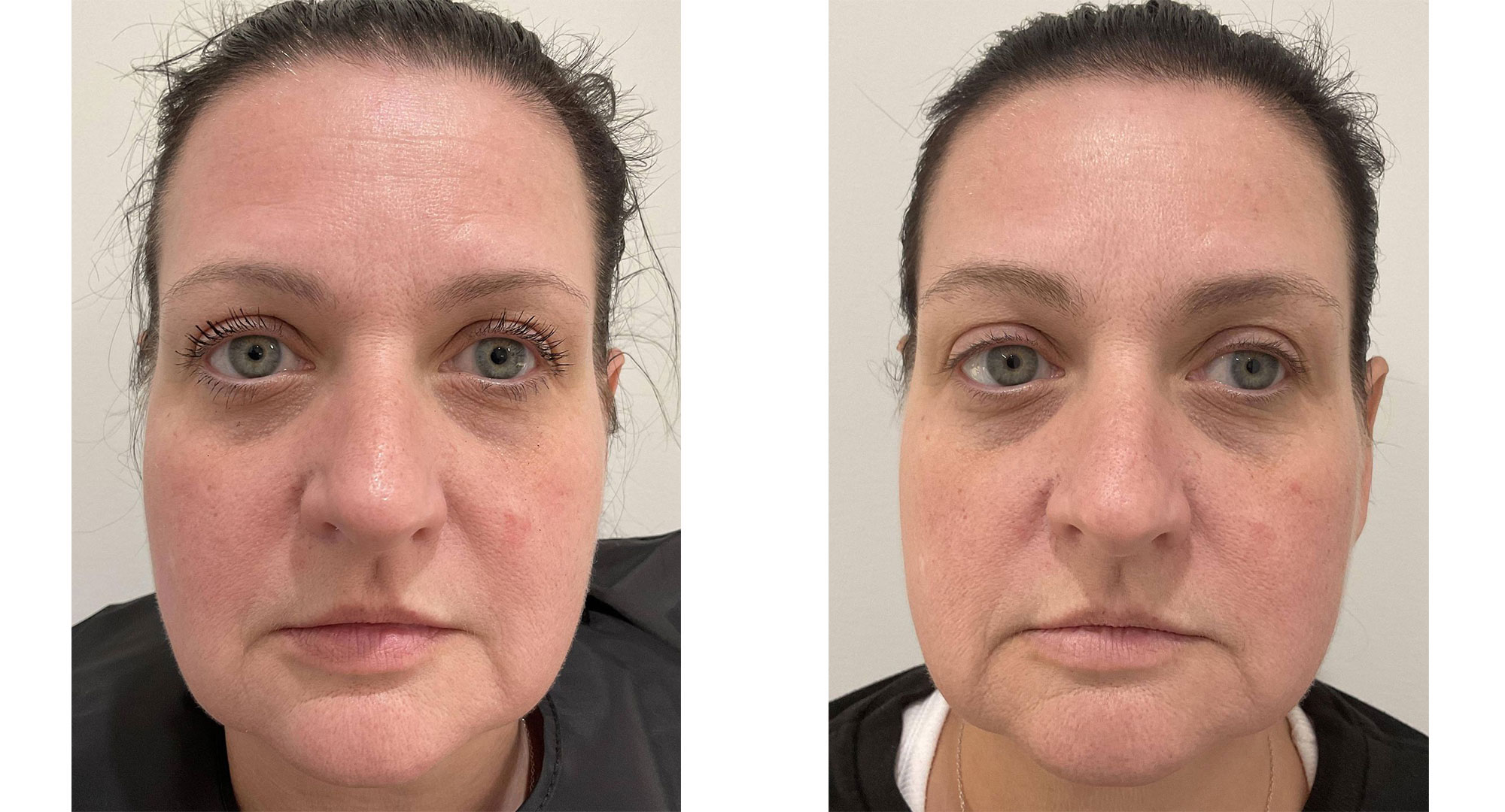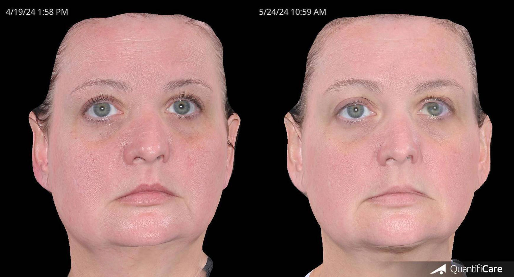 This patient came to us with concerns of skin health and general aging. After only five weeks on a new Radiance skincare regimen, we can see a reduction in fine lines, redness, and pore size. 3D imaging allows us to view photos in even more detail and see a measured reduction in the depth of forehead lines (no needles needed!).