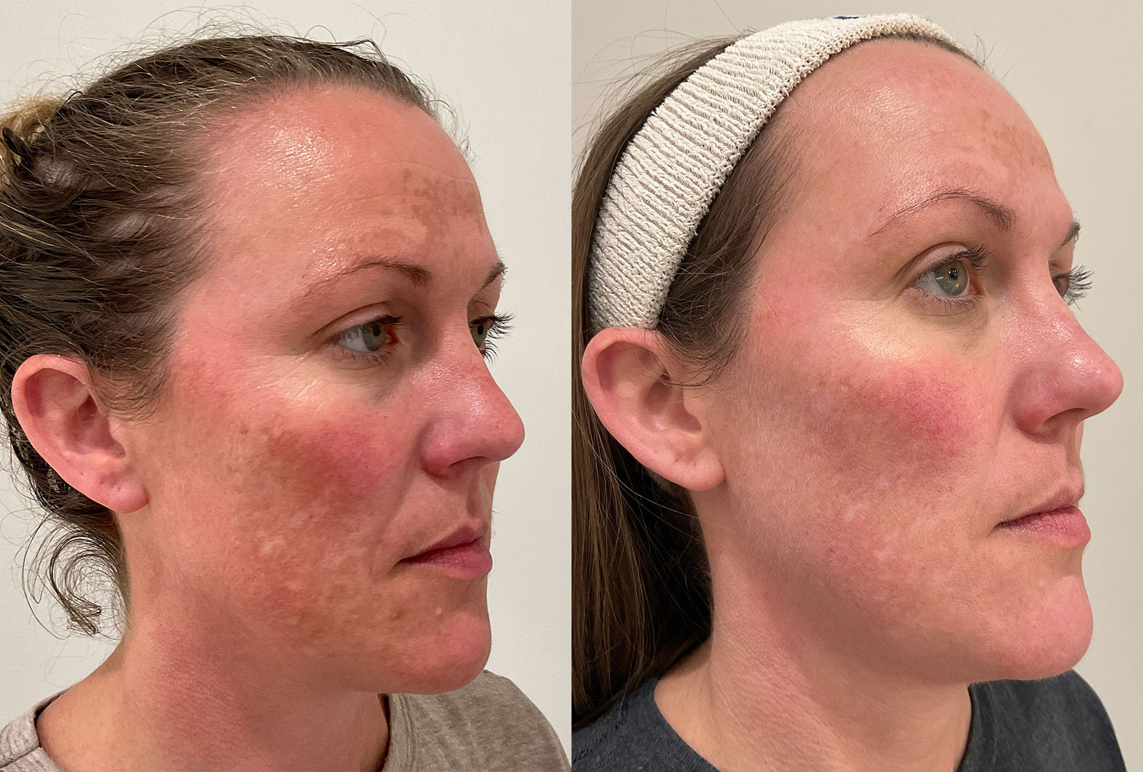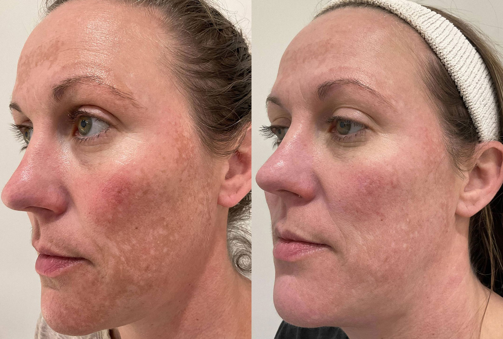 Six months of consistency, science, and amazing results! These photos show the power of a pharmaceutical-grade skincare routine featuring: SkinBetter Even Tone Correcting Serum – targeting discoloration and improving melasma for a more even skin tone. Radiance C+E Brightening Serum – packed with antioxidants to brighten, protect, and repair skin for a radiant, healthy glow. Radiance Age-Defying Retinol Serum 0.25% – a gentle but powerful retinol formula to smooth texture, refine pores, and support skin’s natural renewal process. The results? Noticeable improvement in melasma and rosacea, reduced redness, smoother texture, and overall healthier, glowing skin. This transformation is proof of what happens when you pair quality products with patience and dedication! We will continue to see even more improvement in the future with VI Peels and prescription brighteners at home to target pigmentation and give her clear, glowing skin!
